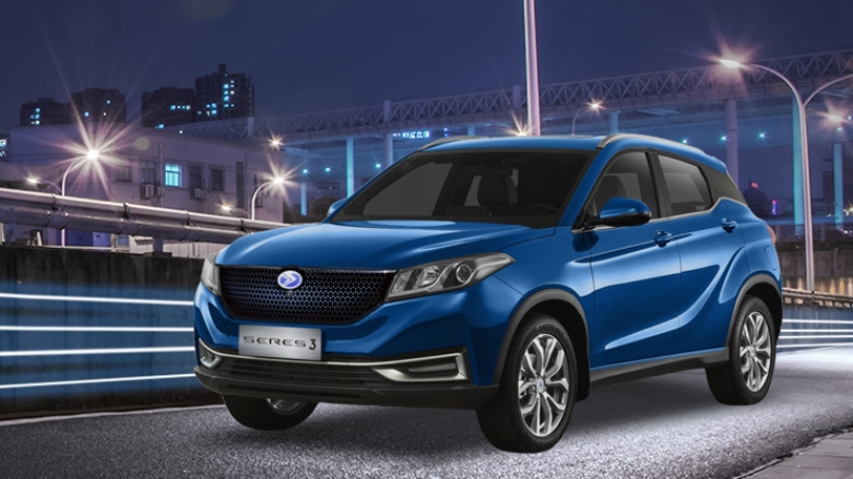 Vehículo eléctrico Seres 3 en carretera con efectos futuristas con edificios de fondo.