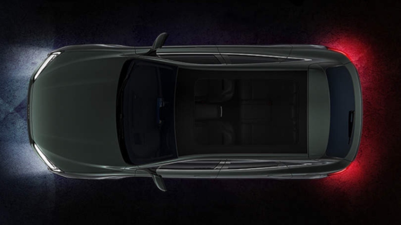Vista superior de SUV eléctrico Seres 5 con techo panorámico y sensores de alerta.
